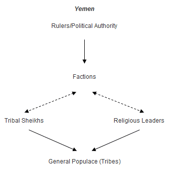 In Yemen, the government developed a political system in which power is channeled through factions and parties. These factions must seek their support from the tribal sheikhs and religious leaders. When such support is given, a faction works directly with the sheikhs or religious leaders to carry out the political process. It does not interface with the general populace or compete for votes in elections. Thus, in Yemen, political modernization has been characterized by the interposition of factions and parties between rulers and sheikhs. The general population has not been directly affected by modernization. Those who are disenfranchised in the new faction-based process—including tribes, religious schools, and minorities—must form their own party—religious or secular—in order to gain access to the political process.