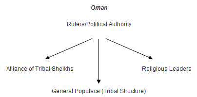 In Oman, all tribal sheikhs have been appended to the Ministry of the Interior, and the religious establishments have also been appended to the government. Meanwhile, the state has created the means to work directly with the general populace. Therefore, in Oman, we find a centralized system in which much of the contact between the state and the sheikhs, religious leaders, and population is direct. A key goal of this structure has been to retain tribal sheikhs as a dynamic in society, while avoiding clashes and factional political among the sheikhs and religious leaders.[14]
