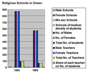 It is interesting to note that the different styles of religious education found in Oman and Yemen have resulted in radically disparate numbers of religious studies students and schools in the two nations, as the following charts by ALESCO[23] show: